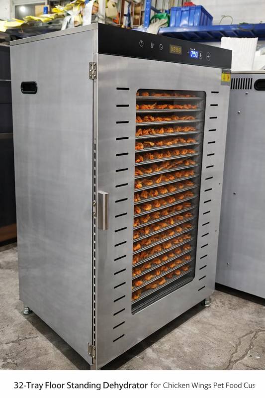 A startup pet food company producing natural dog treats selected our semi-industrial dehydrator machine with 32 trays to support their growing production needs. Their main product, dehydrated chicken wings, required stable temperatures and uniform airflow to maintain quality and safety.
