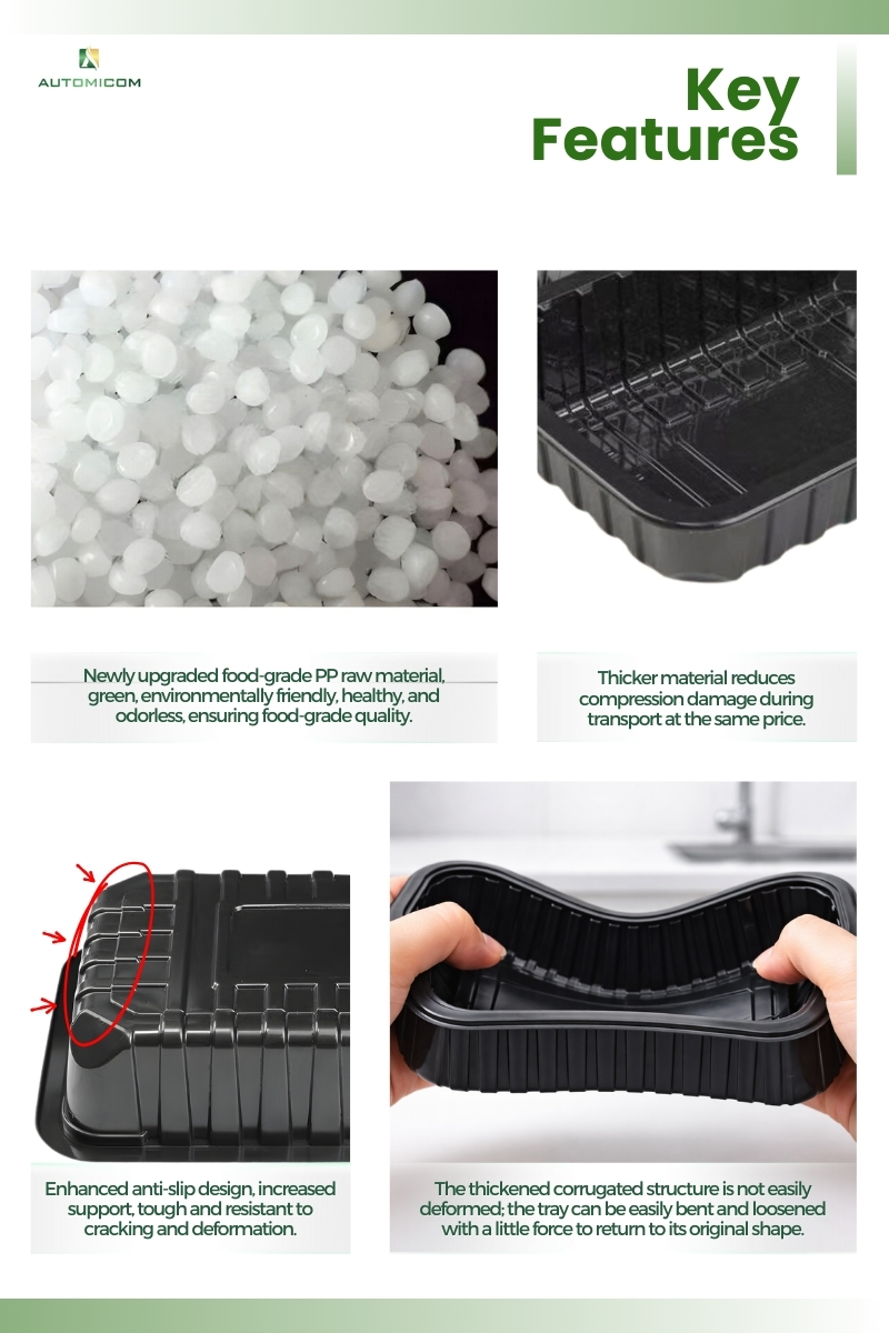 We produce each Plastic food tray from upgraded food-grade polypropylene. Moreover, the material stays odorless, strong, and safe for direct contact with fruits, vegetables, meat, or ready-to-eat items. At the same time, the smart structure handles pressure while keeping the tray lightweight and easy for workers to carry and stack.
