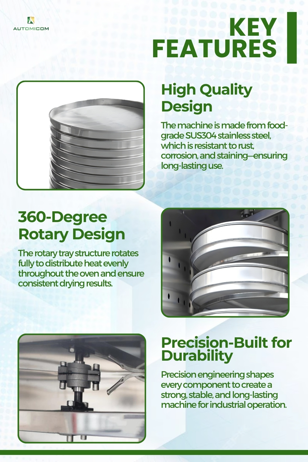 • The rotary tray system delivers uniform heat and consistent drying results.