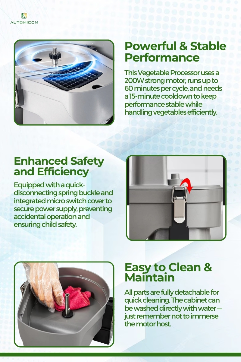 The Vegetables Processor features a strong stainless-steel body that resists rust and keeps hygiene at a high level. Its sharp blades and powerful motor cut vegetables smoothly while keeping their natural freshness. In addition, users can easily control cutting thickness to match different cooking needs. The Vegetable Cutting Machine includes safety switches and a quick disassembly design, allowing fast cleaning and safe operation.
